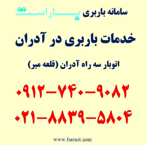 برای سفارش باربری در سه راه آدران، اتوبار در سه راه آدران، حمل بار در محدوده قلعه میر(آدران) و مناطق اطراف با باراست میتوانید همه روزه از ساعت ۹ الی ۱۹ با شماره تلفن های زیر تماس حاصل فرمایید. باراست آماده ارائه انواع خدمات باربری و اسباب کشی در جنوب تهران به خصوص محدوده سه راه آدران، قلعه میر، جاده ساوه و مناطق اطراف با کمترین قیمت باربری است. امکان ارسال انواع ماشین باربری نیسان، خاور و کامیون درون شهری و برون شهری به همراه کارگر متخصص حمل اثاثیه منزل و پرسنل حرفه ای در اسرع وقت امکان پذیر است. برای رزرو و اطلاع از آخرین قیمت باربری و اسباب کشی در سه راه آدران (باراست) با شماره تلفن های زیر تماس حاصل فرمایید.