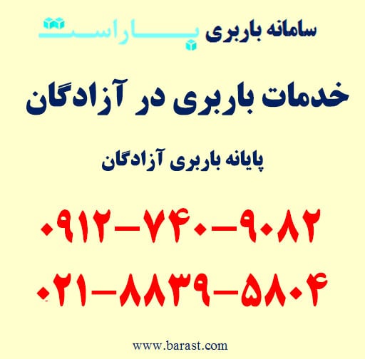 برای سفارش باربری در آزادگان،‌ اتوبار در آزادگان، حمل بار در محدوده بزرگراه آزادگان و مناطق اطراف با باراست می‌توانید همه روزه از ساعت ۹ الی ۱۹ با شماره تلفن های زیر تماس حاصل فرمایید. باراست آماده ارائه انواع خدمات باربری و اسباب کشی در جنوب تهران به خصوص محدوده آزادگان، تهران، اسلامشهر و مناطق اطراف با کمترین قیمت باربری است. امکان ارسال انواع ماشین باربری نیسان، خاور و کامیون درون شهری و برون شهری به همراه کارگر متخصص حمل اثاثیه منزل و پرسنل حرفه ای به درب منزل و محل کار شما در اسرع وقت امکان پذیر است. برای رزرو تلفنی و اطلاع دقیق از آخرین قیمت باربری و اسباب کشی در آزادگان (باراست با شماره تلفن های زیر تماس حاصل فرمایید.