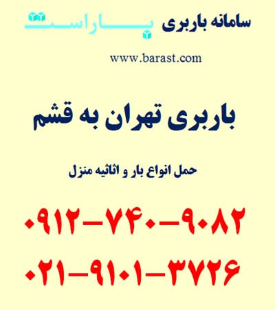 باربری تهران به قشم، حمل بار به قشم و ارسال بار به قشم از خدمات باربری تهران به شهرستان در باراست هست. اگر به باربری تهران به قشم، حمل بار و اثاثیه منزل به قشم یا حمل بار به قشم و هزینه باربری تهران به قشم نیاز دارید، میتوانید با شماره تلفن باربری تهران به قشم تماس بگیرید.