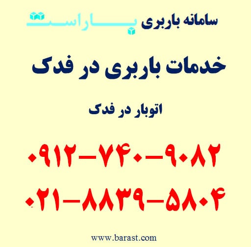 خدمات باربری در فدک، اتوبار در فدک و حمل اثاثیه منزل فدک از خدمات باربری شرق تهران (باراست) است. اگر به باربری در فدک، خدمات اتوبار در فدک، حمل بار در تهرانپارس (فدک) با باراست، اسباب کشی فدک و شماره خدمات باربری در فدک (باراست) نیاز دارید میتوانید با تلفن های زیر تماس حاصل فرمایید.