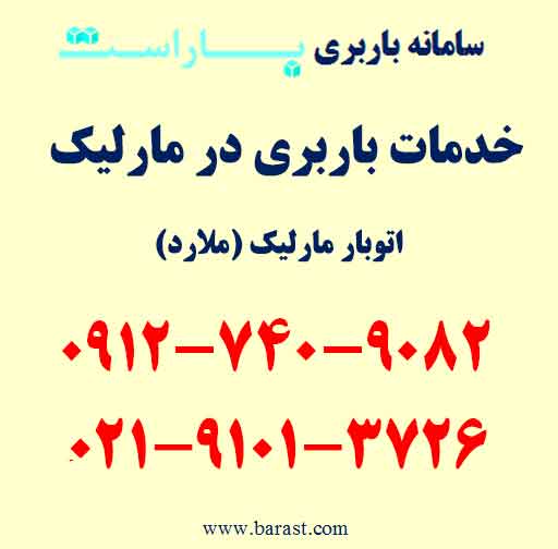 خدمات باربری در مارلیک، اتوبار در مارلیک و حمل اثاثیه منزل مارلیک از خدمات باربری کرج (باراست) است. اگر به باربری در ملارد کرج (مارلیک)، خدمات اتوبار در مارلیک، حمل بار در محدوده مارلیک (ارغوان) با باراست، باربری ارزان مارلیک، کارگر اسباب کشی مارلیک و شماره باربری در مارلیک (باراست) نیاز دارید میتوانید با تلفن های زیر تماس حاصل فرمایید.