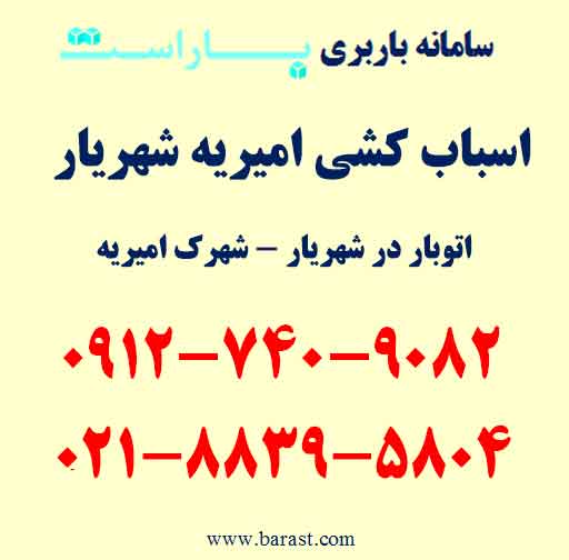باربری امیریه (باراست) یکی از شرکت های فعال و قدیمی باربری در و حمل انواع بار در امیریه می باشد که خدمات اسباب کشی، بسته بندی و جابجایی لوازم منزل را در شهریار ارائه میکند. از خدمات باربری شهریار (امیریه) میتوان به ارائه قیمت ثابت (بدون دبه کردن)، ارسال انواع خودرو باربری (وانت، نیسان، ایسوزو، کامیون، تریلی) و حمل بار به صورت برون شهری از مبدا امیریه شهریار اشاره کرد.