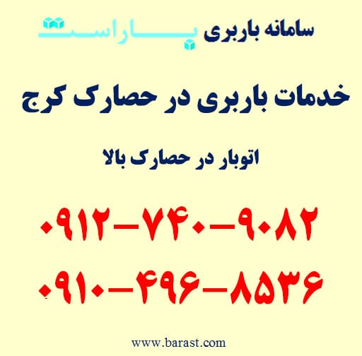خدمات باربری در حصارک، اتوبار در حصارک و حمل اثاثیه منزل حصارک از خدمات باربری کرج (باراست) است. اگر به باربری در حصارک، خدمات اتوبار در حصارک بالا، حمل بار در محدوده کرج (حصارک) با باراست، اسباب کشی حصارک بالا و پایین و شماره خدمات باربری در حصارک (باراست) نیاز دارید میتوانید با تلفن های زیر تماس حاصل فرمایید.