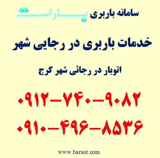 برای سفارس باربری در رجایی شهر، اتوبار در رجایی شهر (گوهردشت)، حمل بار در محدوده رجایی شهر کرج و مناطق اطراف با باراست میتوانید همه روزه از ساعت ۹ الی ۱۹ با شماره تلفن های زیر تماس حاصل فرمایید. باراست آماده ارائه انواع خدمات باربری و اسباب کشی در کرج به خصوص محدوده رجایی شهر و مناطق اطراف با کمترین قیمت باربری است. امکان ارسال انواع ماشین باربری نیسان، خاور و کامیون درون شهری و برون شهری به همراه کارگر متخصص حمل اثاثیه منزل و پرسنل حرفه ای به درب منزل و محل کار شما در اسرع وقت امکان پذیر است. برای رزرو تلفنی و اطلاع دقیق از آخرین قیمت باربری و اسباب کشی در رجائی شهر (باراست) با شماره تلفن های زیر تماس حاصل فرمایید.