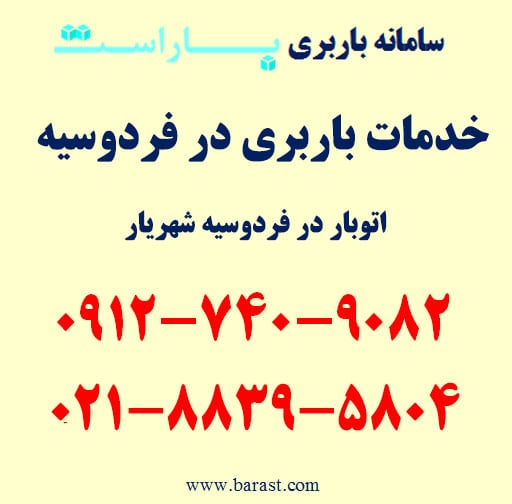 برای سفارش باربری در فردوسیه، اتوبار در فردوسیه، حمل بار در محدوده شهرک فردوسیه شهریار و مناطق اطراف با باراست میتوانید همه روزه از ساعت ۹ الی ۱۹ با شماره تلفن های زیر تماس حاصل فرمایید. باراست آماده ارائه انواع خدمات باربری و اسباب کشی در شهریار به خصوص محدوده فردوسیه، خادم آباد، اندیشه و مناطق اطراف با کمترین قیمت باربری است. امکان ارسال انواع ماشین باربری نیسان، خاور و کامیون درون شهری و برون شهری به همراه کارگر متخصص حمل اثاثیه منزل و پرسنل حرفه ای به درب منزل و محل کار شما در اسرع وقت امکان پذیر است. برای رزرو تلفنی و اطلاع دقیق از آخرین قیمت باربری و اسباب کشی در فردوسیه (باراست) با شماره تلفن های زیر تماس حاصل فرمایید.