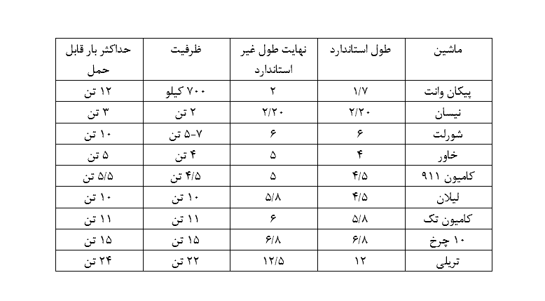 انواع ماشین باربری برای حمل آهن و میلگرد به شرح جدول زیر است.