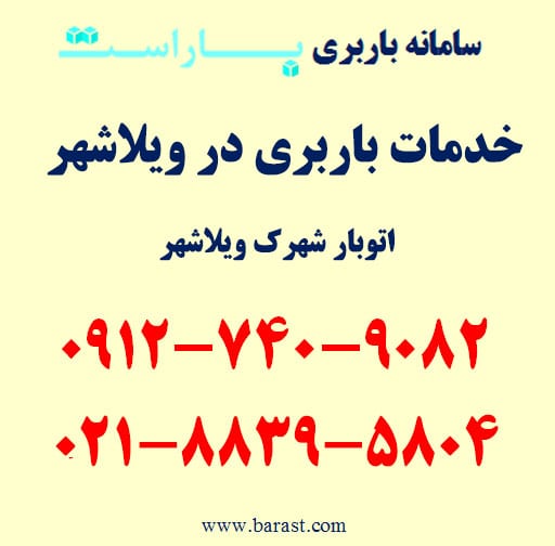برای سفارش باربری در ویلاشهر، اتوبار در ویلاشهر، حمل بار در محدوده چیتگر (شهرک ویلاشهر) و مناطق اطراف با باراست میتوانید همه روزه از ساعت ۹ الی ۱۹ با شماره تلفن های زیر تماس حاصل فرمایید. باراست آماده ارائه انواع خدمات باربری و اسباب کشی در غرب تهران به خصوص محدوده ویلاشهر، چیتگر، دهکده و مناطق اطراف با کمترین قیمت باربری است. امکان ارسال انواع نیسان، خاور و کامیون درون و برون شهری به همراه کارگر متخصص حمل اثاثیه منزل امکان پذیر است. برای رزرو باربری و اطلاع دقیق از قیمت باربری و اسباب کشی در ویلاشهر (باراست) با شماره تلفن های زیر تماس حاصل فرمایید.
