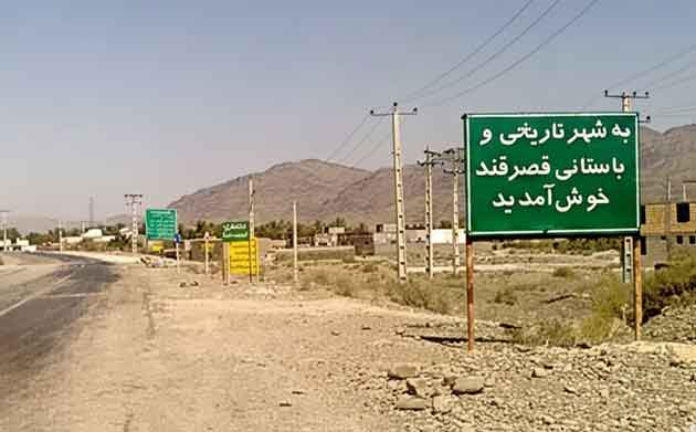 فاصلهٔ کرج تا قصرقند حدود ۱۷۵۰ کیلومتر است و با خودروی سواری در حدود ۱۹ ساعت طی میشود. مسیر اصلی از طریق جادههای کرج–تهران–قم–کاشان–یزد–کرمان–بم–ایرانشهر–نیکشهر به قصرقند میگذرد. مسیر تردد خاور و نیسان همان جادهٔ نیکشهر–قصرقند است. زمان رسیدن ماشین باربری نیسان (وانت) از کرج به قصرقند حدود ۲۹ ساعت و ماشین باربری خاور (کامیونت، ایسوزو و …) حدود ۳۸ ساعت میباشد.