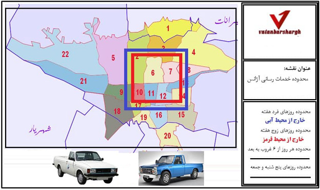 از آنجایی که طرح زوج و فرد و طرح ترافیک در شهر تهران امکان خدمات رسانی در طول روز به تمام نقاط شهر تهران را با مشکل مواجه می سازد و از اول تیرماه نیز بر اساس طرح ترافیک امکان خدمات رسانی در طول روز به داخل محدوده زوج و فرد سابق همراه با دریافت هزینه (برای سرویس های سواری روزانه 13800 تومان و برای سرویس های باری وانتی 16000 تومان) می باشد. بنابراین حتی الامکان سرویس خود در این روزها را به ساعات ابتدایی و یا انتهایی روز یعنی ساعت 5 تا 6 بعدظهر انتقال دهید تا از هزینه کمتری برای سرویس خود برخوردار شوید.