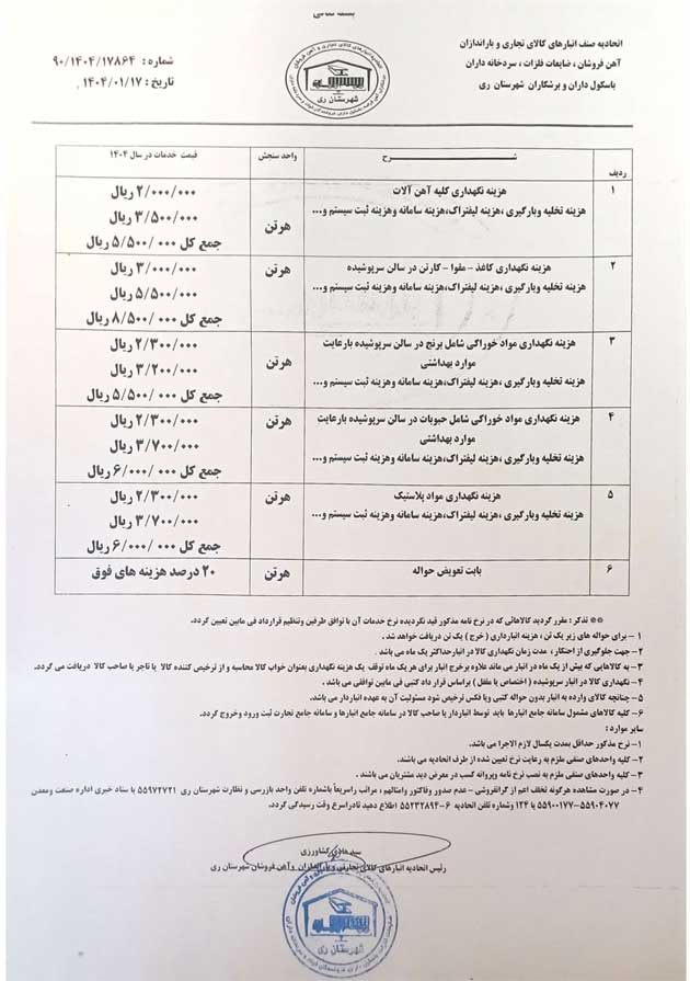 با توجه به استعلام بعمل آمده در خصوص تعرفه نرخ انبارداری و باسکول وسایل نقلیه باری در شهر تهران در سال 1402 به تصویر زیر نرخ اتحادیه اتحادیه صنف انبارهای کالاهای تجاری و آهن فروشان ، برش کاران ، آهن قراضه ، باسکول داران ، فولاد و سردخانه داران جهت اطلاع و بهره برداری لازم درج گردیده است.