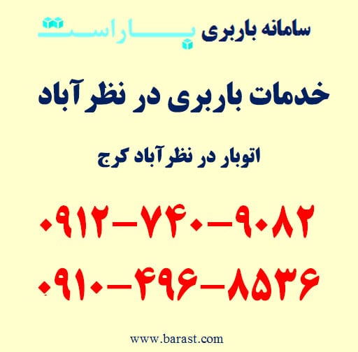 خدمات باربری در نظرآباد، اتوبار در نظرآباد و حمل اثاثیه منزل نظرآباد از خدمات باربری کرج (باراست) است. اگر به باربری در نظرآباد، خدمات اتوبار در نظرآباد، حمل بار در محدوده کرج (نظرآباد) با باراست، اسباب کشی نظرآباد و شماره خدمات باربری در نظرآباد (باراست) نیاز دارید میتوانید با تلفن های زیر تماس حاصل فرمایید.