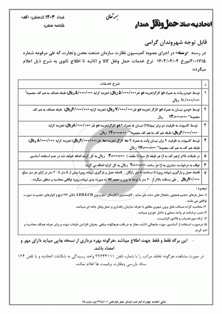 نرخ باربری همدان ۱۴۰۳