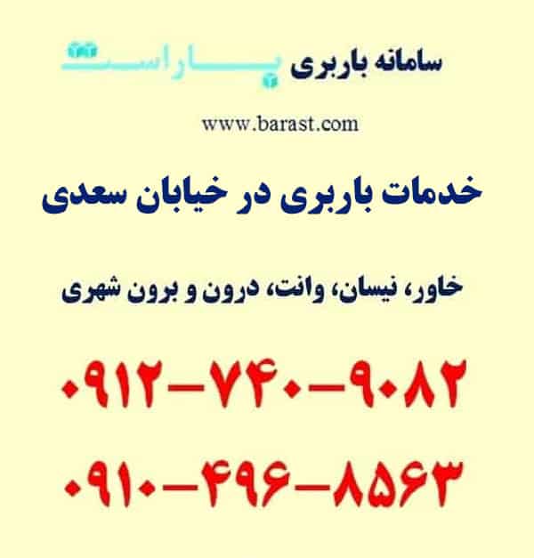 برای سفارس باربری در سعدی، اتوبار در سعدی، حمل بار در محدوده سعدی شمالی و جنوبی تهران و مناطق اطراف با باراست میتوانید همه روزه از ساعت ۹ الی ۱۹ با شماره تلفن های زیر تماس حاصل فرمایید. باراست آماده ارائه انواع خدمات باربری و اسباب کشی در جنوب تهران به خصوص محدوده سعدی و مناطق اطراف با کمترین قیمت باربری است. امکان ارسال انواع ماشین باربری نیسان، خاور و کامیون درون شهری و برون شهری به همراه کارگر متخصص حمل اثاثیه منزل و پرسنل حرفه ای به درب منزل و محل کار شما در اسرع وقت امکان پذیر است. برای رزرو تلفنی و اطلاع دقیق از آخرین قیمت باربری و اسباب کشی در سعدی (باراست) با شماره تلفن های زیر تماس حاصل فرمایید.