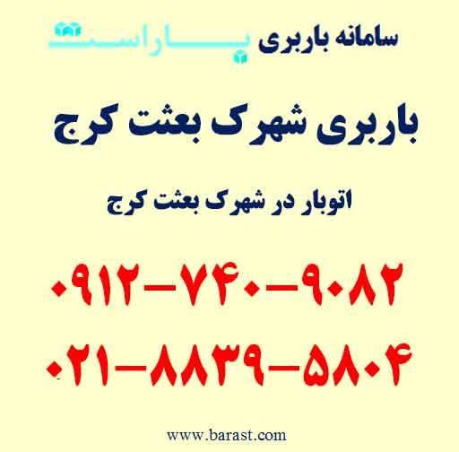 برای سفارس باربری در شهرک بعثت،‌ اتوبار در شهرک بعثت مشگین دشت، حمل بار در محدوده شهرک بعثت کرج و مناطق اطراف با باراست می‌توانید همه روزه از ساعت ۹ الی ۱۹ با شماره تلفن های زیر تماس حاصل فرمایید. باراست آماده ارائه انواع خدمات باربری و اسباب کشی در کرج به خصوص محدوده شهرک بعثت و مناطق اطراف با کمترین قیمت باربری است. امکان ارسال انواع ماشین باربری نیسان، خاور و کامیون درون شهری و برون شهری به همراه کارگر متخصص حمل اثاثیه منزل و پرسنل حرفه ای به درب منزل و محل کار شما در اسرع وقت امکان پذیر است. برای رزرو تلفنی و اطلاع دقیق از آخرین قیمت باربری و اسباب کشی در شهرک بعثت (باراست با شماره تلفن های زیر تماس حاصل فرمایید.