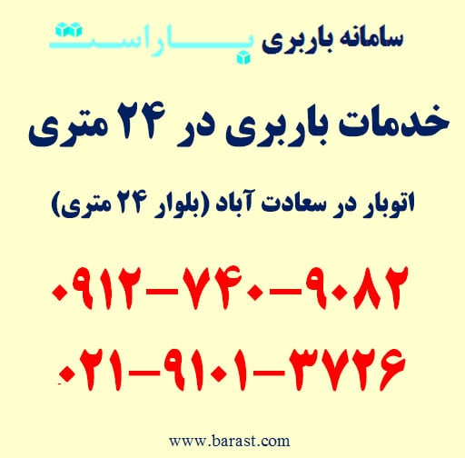 خدمات باربری در ۲۴ متری، اتوبار در ۲۴ متری و حمل اثاثیه منزل بلوار ۲۴ متری از خدمات باربری در سعادت آباد (باراست) است. اگر به باربری در ۲۴ متری، خدمات اتوبار در بلوار ۲۴ متری، حمل بار در محدوده سعادت آباد (۲۴ متری) با باراست، اسباب کشی ۲۴ متری و شماره خدمات باربری در ۲۴ متری (باراست) نیاز دارید میتوانید با تلفن های زیر تماس حاصل فرمایید.