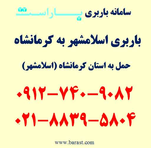 باربری اسلامشهر به کرمانشاه، حمل بار به کرمانشاه از خدمات باربری اسلامشهر به شهرستان در باراست است. برای باربری اسلامشهر به کرمانشاه (اسلام آباد غرب)، هزینه حمل بار از اسلامشهر به کرمانشاه با باراست، حمل اثاثیه منزل به کرمانشاه و شماره خدمات باربری اسلامشهر به کرمانشاه (باراست) با تلفن های زیر تماس بگیرید