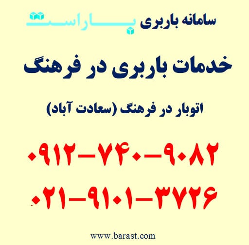 خدمات باربری در فرهنگ، اتوبار در فرهنگ و حمل اثاثیه منزل فرهنگ از خدمات باربری در سعادت آباد (باراست) است. اگر به باربری در فرهنگ، خدمات اتوبار در فرهنگ، حمل بار در محدوده سعادت آباد (فرهنگ) با باراست، اسباب کشی فرهنگ و شماره خدمات باربری در فرهنگ (باراست) نیاز دارید میتوانید با تلفن های زیر تماس حاصل فرمایید.