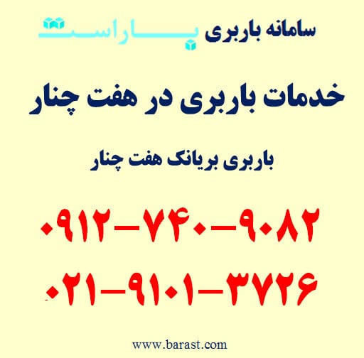 برای سفارش باربری در هفت چنار، اتوبار در هفت چنار، حمل بار در محدوده هفت چنار تهران و مناطق اطراف با باراست میتوانید همه روزه از ساعت ۹ الی ۱۹ با شماره تلفن های زیر تماس حاصل فرمایید. باراست آماده ارائه انواع خدمات باربری و اسباب کشی در جنوب تهران به خصوص محدوده هفت چنار، نواب، بریانک و مناطق اطراف با کمترین قیمت باربری است. امکان ارسال انواع ماشین باربری نیسان، خاور و کامیون درون شهری و برون شهری به همراه کارگر متخصص حمل اثاثیه منزل و پرسنل حرفه ای به درب منزل و محل کار شما در اسرع وقت امکان پذیر است. برای رزرو تلفنی و اطلاع دقیق از آخرین قیمت باربری و اسباب کشی در هفت چنار (باراست) با شماره تلفن های زیر تماس حاصل فرمایید.