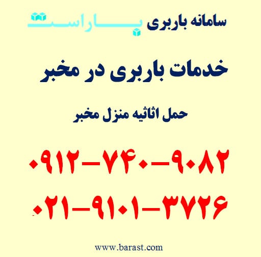 برای سفارش باربری در مخبر،‌ اتوبار در مخبر، حمل بار در محدوده مخبر تهران و مناطق اطراف با باراست می‌توانید همه روزه از ساعت ۹ الی ۱۹ با شماره تلفن های زیر تماس حاصل فرمایید. باراست آماده ارائه انواع خدمات باربری و اسباب کشی در شرق تهران به خصوص محدوده مخبر و مناطق اطراف با کمترین قیمت باربری است. امکان ارسال انواع ماشین باربری نیسان، خاور و کامیون درون شهری و برون شهری به همراه کارگر متخصص حمل اثاثیه منزل و پرسنل حرفه ای به درب منزل و محل کار شما در اسرع وقت امکان پذیر است. برای رزرو تلفنی و اطلاع دقیق از آخرین قیمت باربری و اسباب کشی در مخبر (باراست با شماره تلفن های زیر تماس حاصل فرمایید.