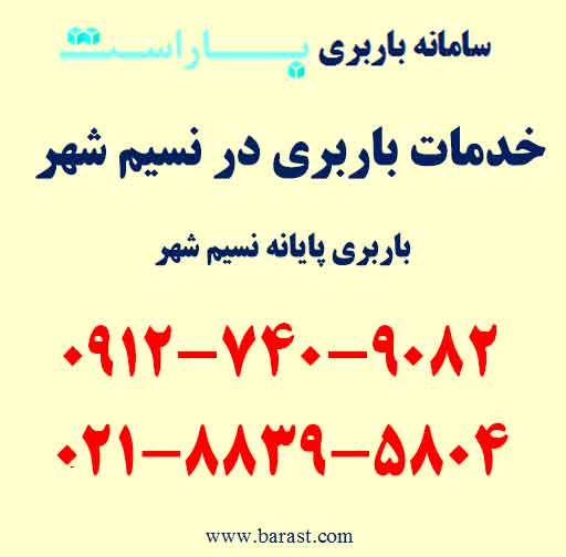 برای سفارش باربری در نسیم شهر، پایانه نیسم شهر، حمل بار در محدوده نسیم شهر (اسلامشهر) و مناطق اطراف با باراست میتوانید همه روزه از ساعت ۹ الی ۱۹ با شماره تلفن های زیر تماس حاصل فرمایید. باراست آماده ارائه انواع خدمات باربری و اسباب کشی در جنوب تهران به خصوص محدوده نسیم شهر، اسلامشهر، شهرری و مناطق اطراف با کمترین قیمت باربری است. امکان ارسال انواع نیسان، خاور و کامیون درون و برون شهری به همراه کارگر متخصص حمل اثاثیه منزل امکان پذیر است. برای رزرو باربری و اطلاع دقیق از قیمت باربری و اسباب کشی در نسیم شهر (باراست) با شماره تلفن های زیر تماس حاصل فرمایید.