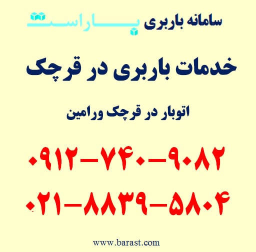 خدمات باربری در قرچک، اتوبار در قرچک و حمل اثاثیه منزل قرچک از خدمات باربری ورامین (باراست) است. اگر به باربری در قرچک، خدمات اتوبار در قرچک، حمل بار در محدوده ورامین (قرچک) با باراست، اسباب کشی قرچک و شماره خدمات باربری در قرچک (باراست) نیاز دارید میتوانید با تلفن های زیر تماس حاصل فرمایید.