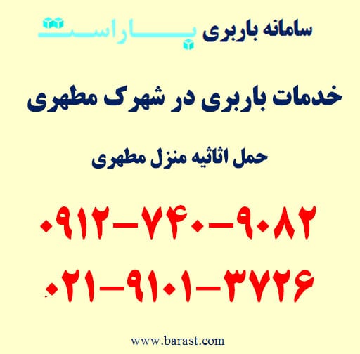 برای سفارش باربری در شهرک مطهری، اتوبار در مطهری، حمل بار در محدوده شهرک مطهری و مناطق اطراف با باراست میتوانید همه روزه از ساعت ۹ الی ۱۹ با شماره تلفن های زیر تماس حاصل فرمایید. باراست آماده ارائه انواع خدمات باربری و اسباب کشی در جنوب تهران به خصوص محدوده شهرک مطهری و مناطق اطراف با کمترین قیمت باربری است. امکان ارسال انواع ماشین باربری نیسان، خاور و کامیون درون شهری و برون شهری به همراه کارگر متخصص حمل اثاثیه منزل و پرسنل حرفه ای به درب منزل و محل کار شما در اسرع وقت امکان پذیر است. برای رزرو تلفنی و اطلاع دقیق از آخرین قیمت باربری و اسباب کشی در شهرک مطهری (باراست) با شماره تلفن های زیر تماس حاصل فرمایید.