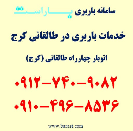 برای سفارش باربری در طالقانی، اتوبار در طالقانی، حمل بار در محدوده طالقانی و مناطق اطراف با باراست میتوانید همه روزه از ساعت ۹ الی ۱۹ با شماره تلفن های زیر تماس حاصل فرمایید. باراست آماده ارائه انواع خدمات باربری و اسباب کشی در کرج به خصوص محدوده طالقانی، عظیمیه، جهانشهر و مناطق اطراف با کمترین قیمت باربری است. امکان ارسال انواع نیسان، خاور و کامیون درون و برون شهری به همراه کارگر متخصص حمل اثاثیه منزل امکان پذیر است. برای رزرو باربری و اطلاع دقیق از قیمت باربری و اسباب کشی در طالقانی (باراست) با شماره تلفن های زیر تماس حاصل فرمایید.