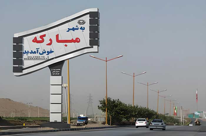 فاصلهٔ تهران تا مبارکه حدود ۵۰۰ کیلومتر است و با خودروی سواری در حدود ۵ ساعت طی میشود.